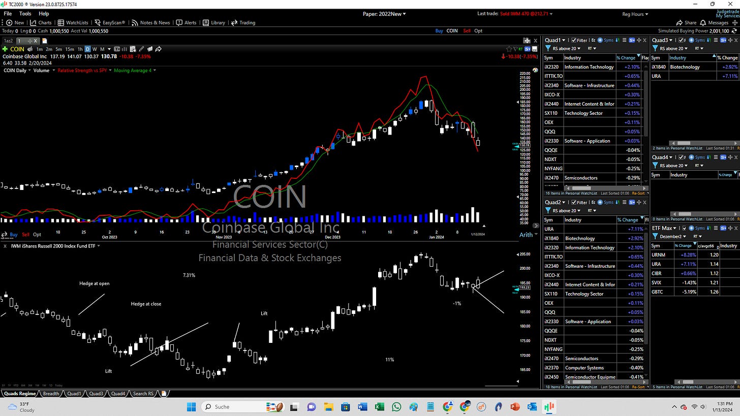 Thanks for sharing! Which is the time horizon you use to look at relative outperformance of constituents vs. SPY ETF in each quad section ? 1 week or more? Many thanks. I've programmed a Relative Price change, scaled by the volatility / ATR in the last 3-4 bars in TC2000 and use it for tracking which sectors outperform the SPY ETF on D1 and W1 timeframes. This gives an volatility/ATR adjusted move against the volatility adjusted move of the baseline / SPY ETF- so if the outcome for CIBR is 0.93 the interpretation would be that the move is positive and 0.93 ATRs stronger vs. the move in the baseline ticker, considering baseline move and volatility measured through ATR. Cheers.