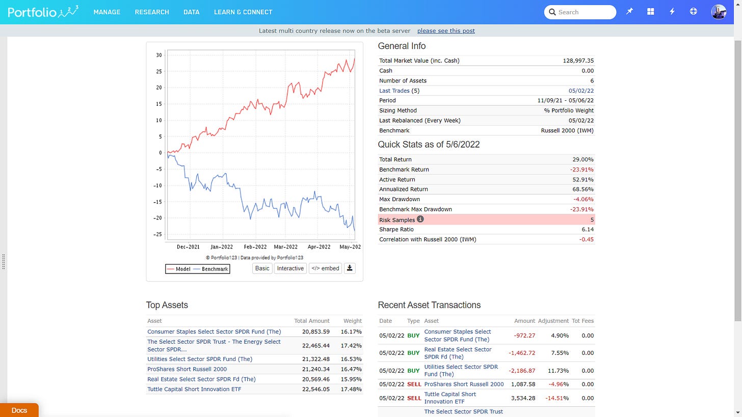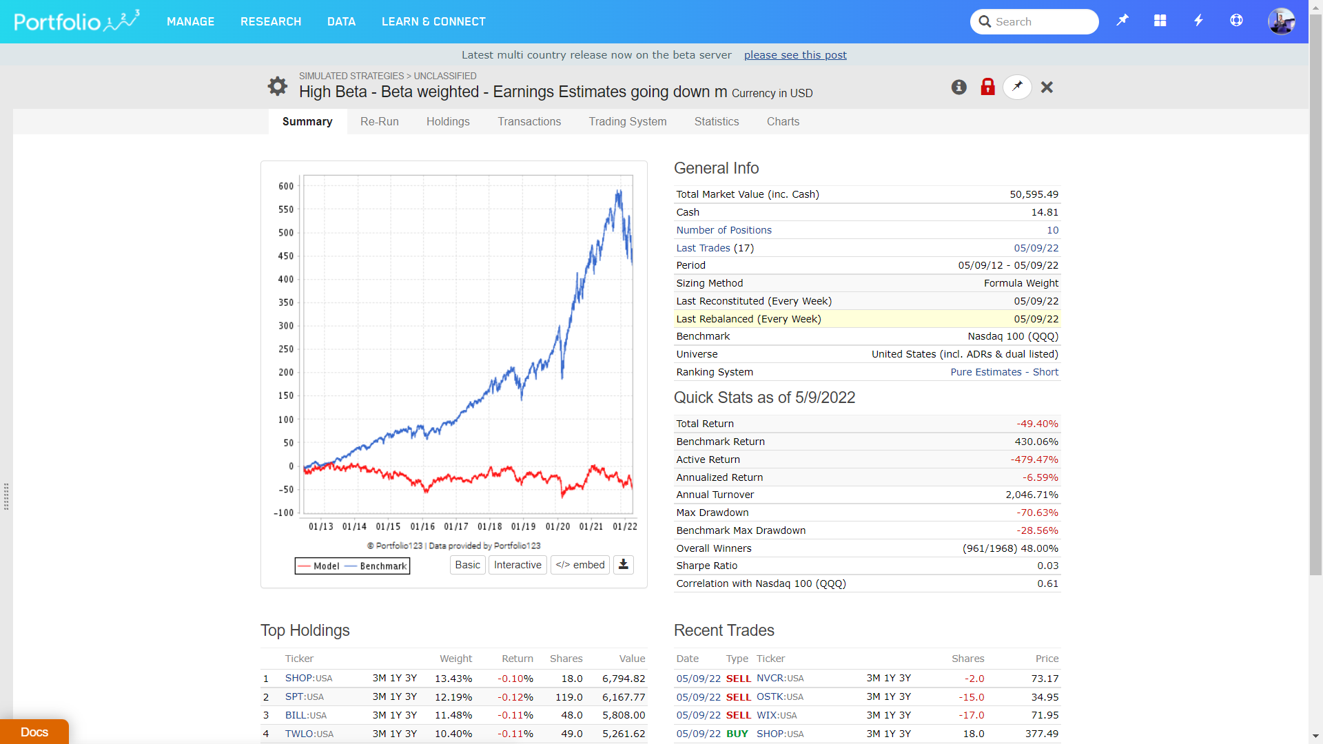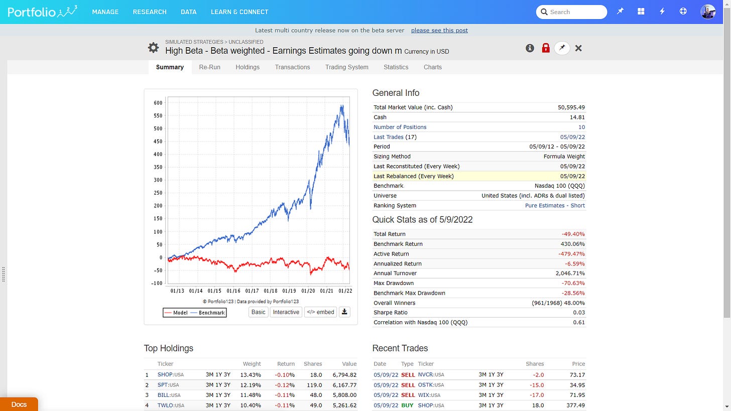 The below strategy is a high beta stock trading system, that picks high beta stocks, weights them by high beta (the highest beta stocks get the biggest weight) and which have bad earnings estimate revisions: