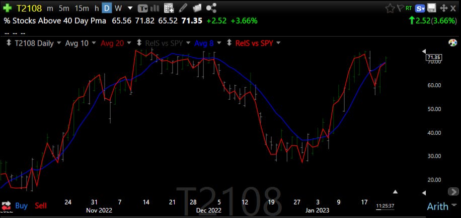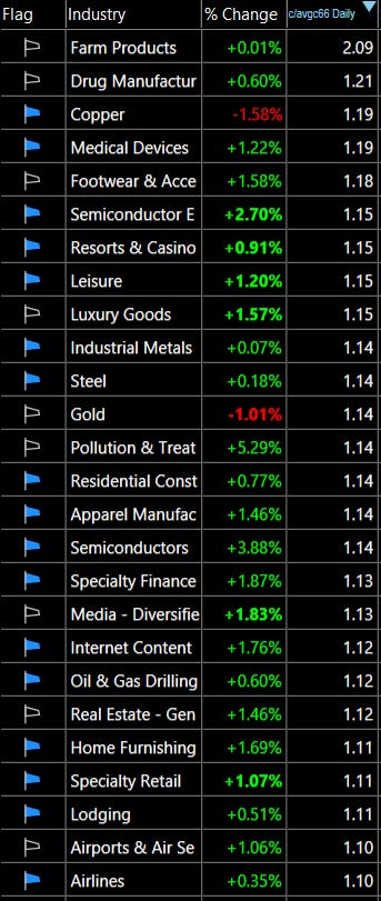 This is a list of Industry Groups sorted by 66 Day Momentum. The flagged ones are cycs. and higher beta IGs. They are leading! Good! At the bottom of that list you find more and more IGs that are defensive. Good!