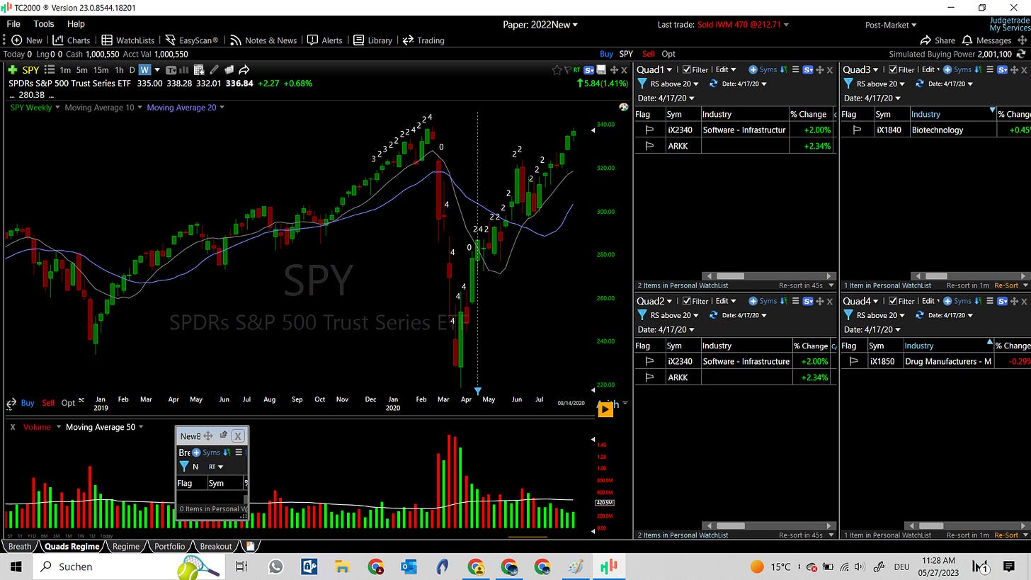 On the right side of the following Chart are instruments divided by 4 buckets (Quad 1 - 4). On the left is the SPY weekly. The numbers show the Quad of that week —>