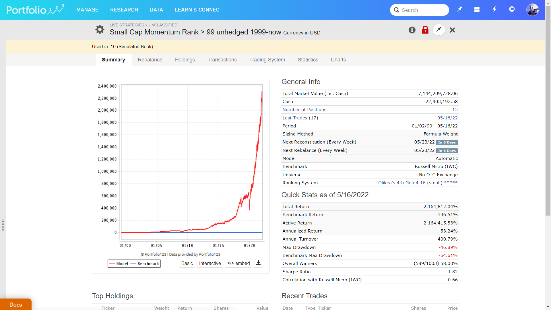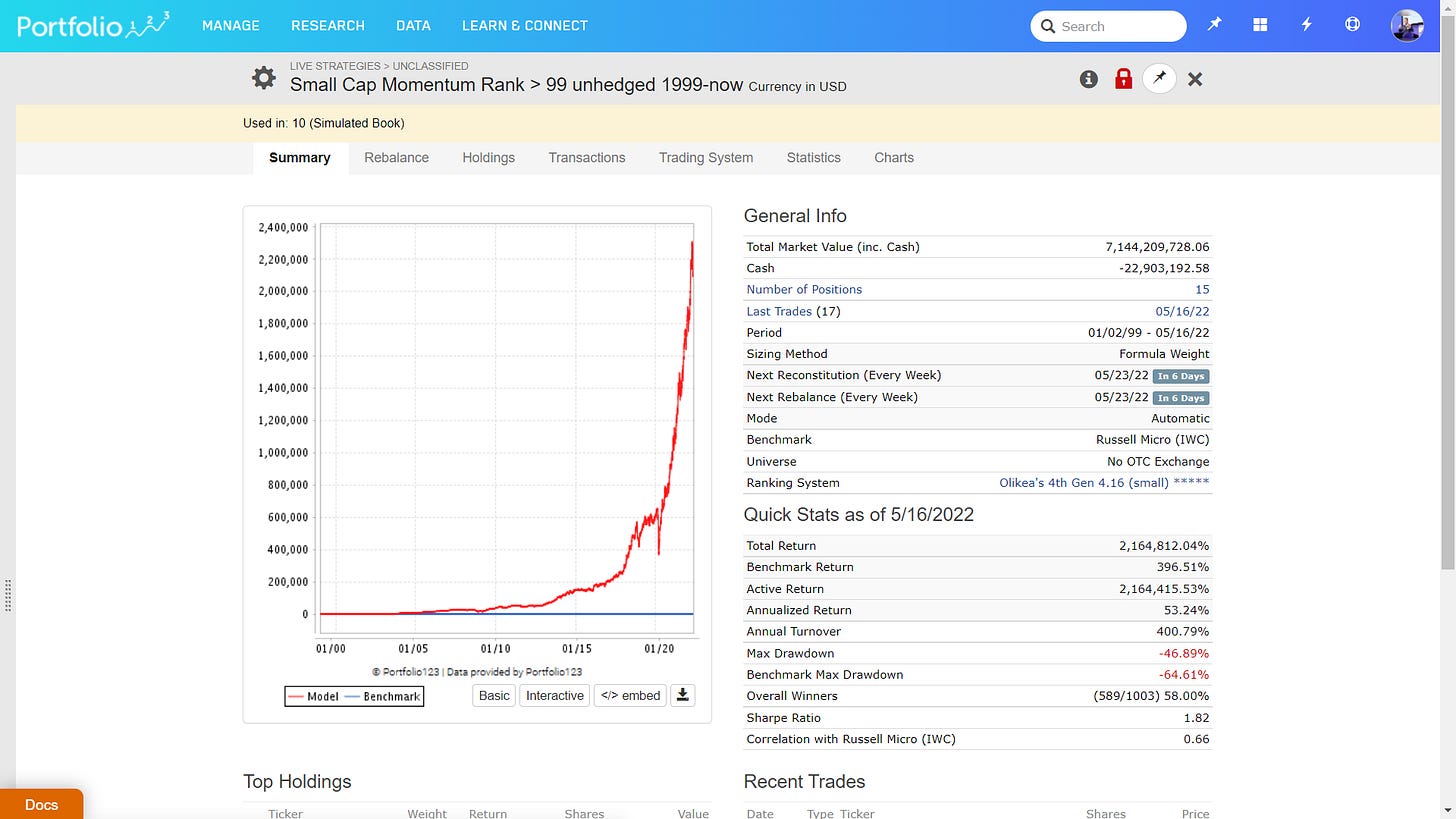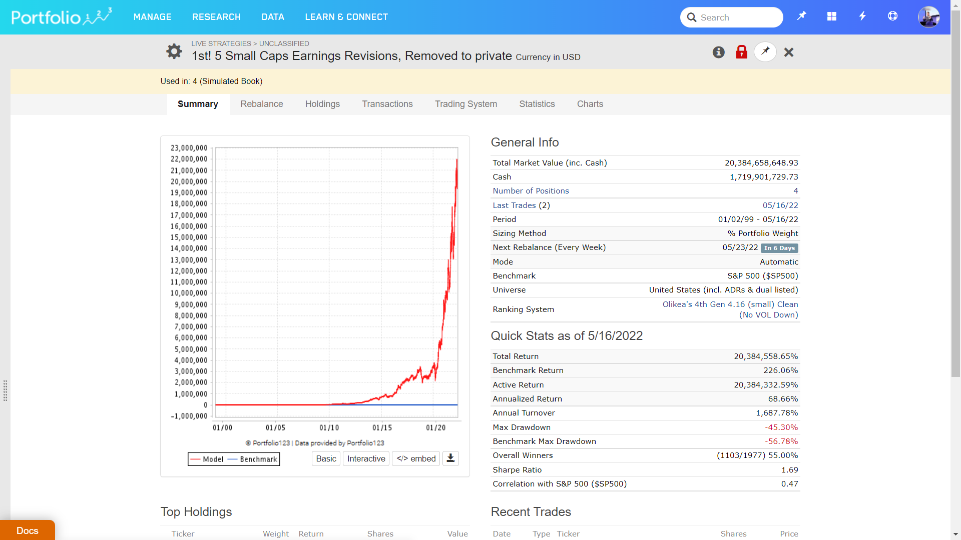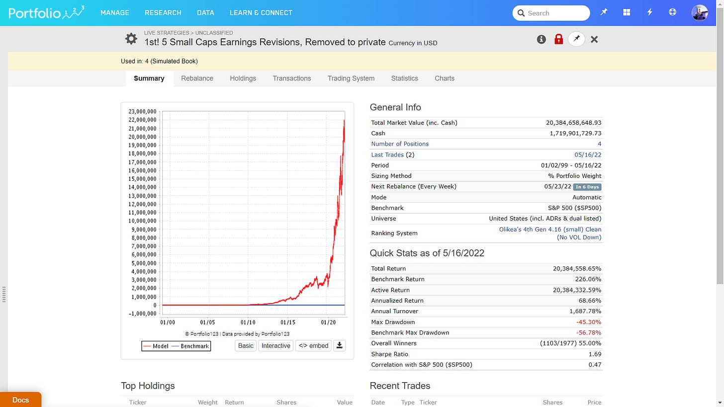 Third I got more strategies that I can rent out but not via portfolio123.com because their liquidity constraints are pretty high (AvgDailyTot(20) > 300000). I have strategies with AvgDailyTot(20) > 100000 (100k dollar amount traded in the last 20 days on average per day) which are great for smaller accounts (sub 200k-500k, depending on the number of stocks the strategy trades).