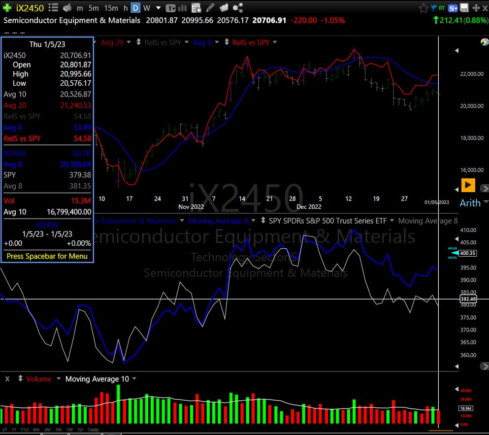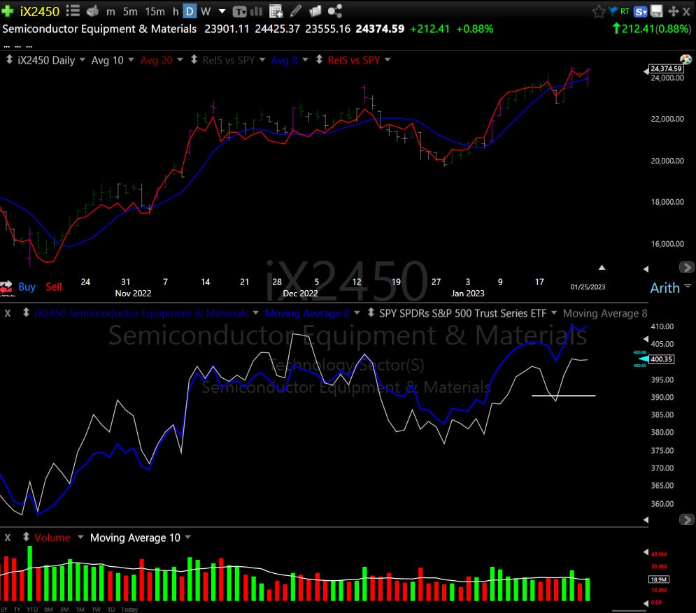Second watch higher beta industry groups (cycs and tech even more, in this example it is semiconductor equipment, here the chart template: https://www.tc2000.com/~XSmp5h):