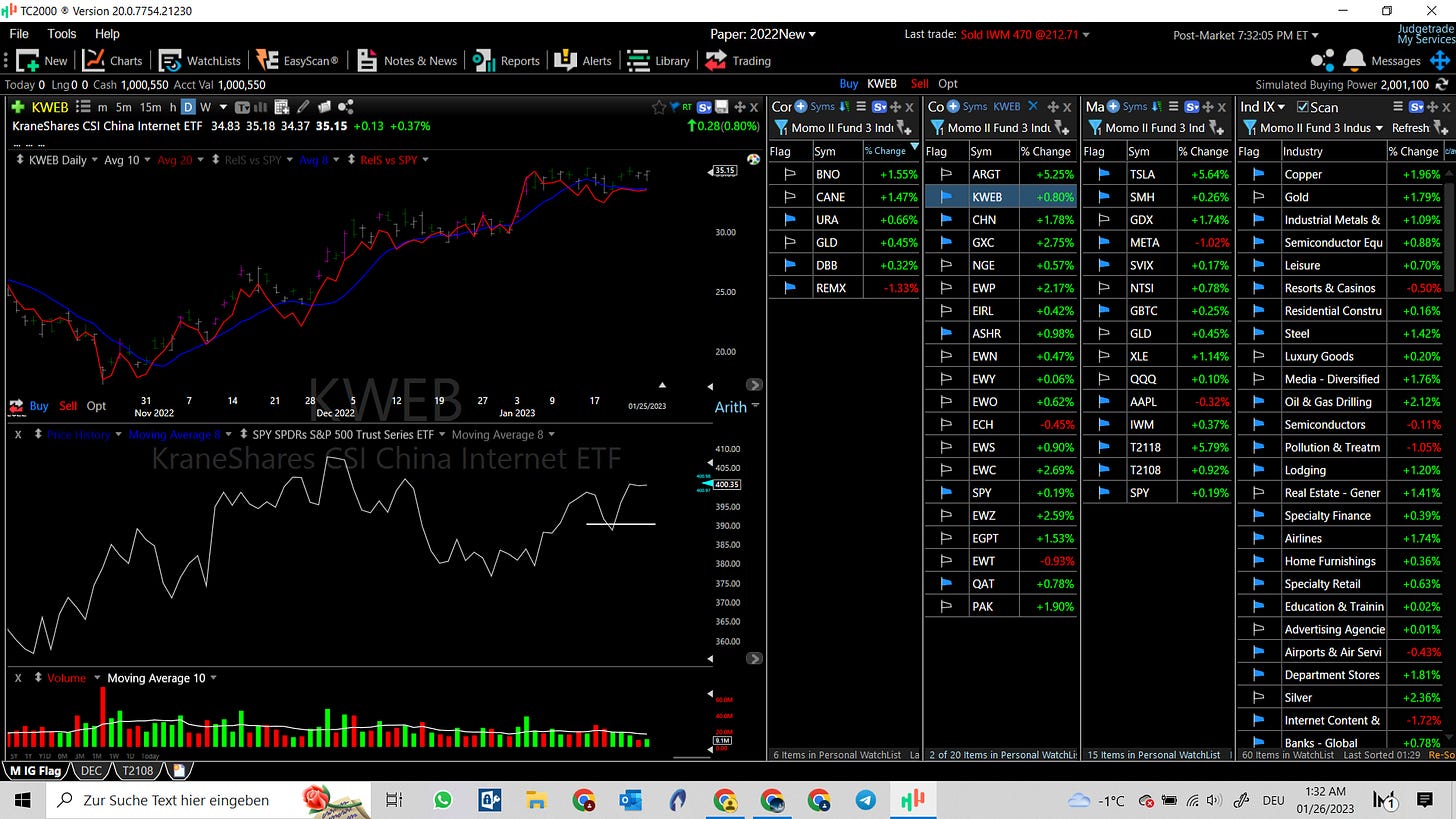 Above chart (upper half): The red line is the relative strength of the underlying to the SPY. The blue line (upper half) is the 8 MA of relative strength. When you see the red line crossing up the blue line it means strength. The lower part: Blue line is the IG and the white line is the SPY. You want to see the blue line above the white one (also use weekly!).