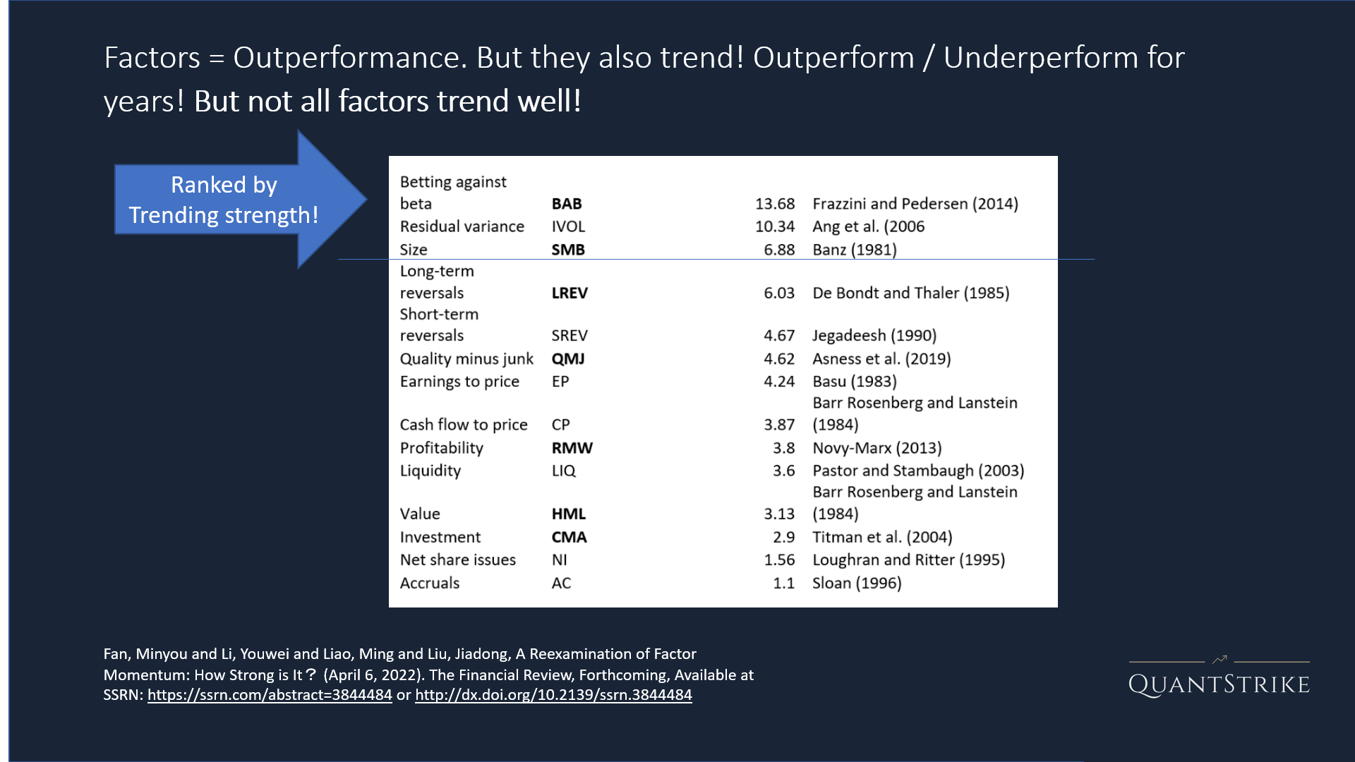 Factors that trend well are factors which when up 4 Weeks with momentum and relative strength (in pullbacks comes the truth!), they tend to go up further.